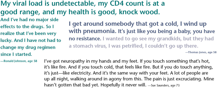 In addition, older people with HIV are more likely to experience “co-morbidities” like heart, kidney, and liver diseases, neuropathy, arthritis, and some cancers. The virus may also speed up the aging process, even among people with seemingly well-controlled HIV, including an “undetectable viral load”: some men and women with HIV in their 50s experience problems that normally develop much later in life, like osteoporosis (particularly unexpected in men), certain cancers, diabetes, and dementia. Some of the medicines patients take to address these illnesses cannot be combined with certain HIV medications, making treatment even more challenging.