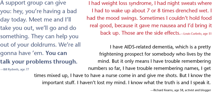 Support groups are marvelous. The world is filled with beautiful people who are gonna help you stay healthy. Most of my family is dead by now and I needed family. My family is my community of gay people and they have been wonderful, not that heterosexuals haven’t been grand to me either. —Bill Rydwels, age 77