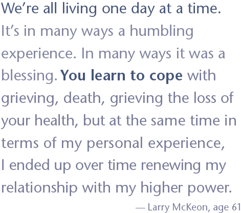 My own experience of dealing with depression and anxiety really came out after I got sober. So probably I had those issues for a long time, but I was self-medicating with alcohol. And that really became apparent when Ray died. I had a tough year. —Larry McKeon, age 61