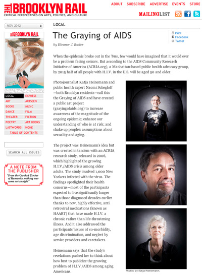 The Brooklyn Rail featured this piece on The Graying of AIDS that explores some of the history of our project and highlights our recent internationally-focused work, while progressive news service IPSnews.net interviewed Graying’s Naomi Schegloff for this syndicated article on older adults living with HIV/AIDS, which was also published in Spanish.